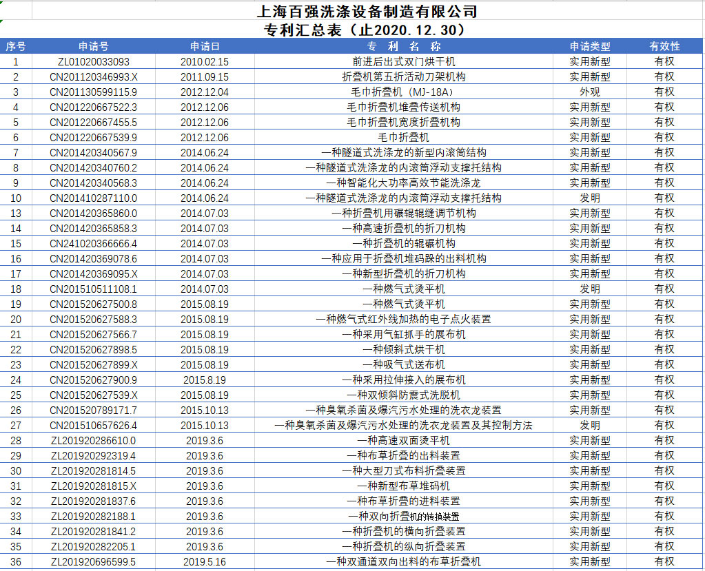 目前,我公司的產(chǎn)品,如隧道式洗衣機及相關(guān)機組,槽式熨平機、展布機、送布機、毛巾折疊機,布草折疊機,前進后出式烘干機及高脫水率洗脫機、燃氣式烘干機、燃氣式熨平機在市場上獲得了越來越多的客戶的認可。敬業(yè)、鉆研、真誠是我們百強公司全體員工的基本素質(zhì)要求,努力使每一臺洗滌設(shè)備成為優(yōu)質(zhì)合格的產(chǎn)品,是百強企業(yè)人的目標(biāo)。百強不斷進取,多方面學(xué)習(xí),改進提升產(chǎn)品性能,結(jié)合多年的加工制造經(jīng)驗,并采購符合國家或行業(yè)相關(guān)標(biāo)準(zhǔn)的配件,以確保機器結(jié)構(gòu)性能穩(wěn)定、經(jīng)久耐用、造型美觀大氣。在發(fā)展的過程中,百強先后通過了ISO9001質(zhì)量管理體系認證,ISO14001環(huán)境管理體系認證,ISO45001職業(yè)健康安全管理體系認證、產(chǎn)品質(zhì)量CE認證,成為了為數(shù)不多的中國輕工協(xié)會洗滌裝備分會理事單位,中國商業(yè)聯(lián)合會理事單位和中國洗滌機械行業(yè)十強企業(yè),上海市高新技術(shù)企業(yè)。以質(zhì)取信、以信取人是百強人永遠不變的精神理念。