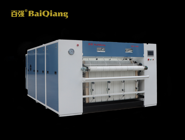 1、本機(jī)前端兩個烘筒采用高低結(jié)構(gòu)排列,布草S型走向通過兩個烘筒,使布草的雙面都可以得到有效熨燙。而且每個烘筒上熨平帶的有效包角均高達(dá)300度左右,相較于槽燙和普通平燙,熨燙效率大幅提高。